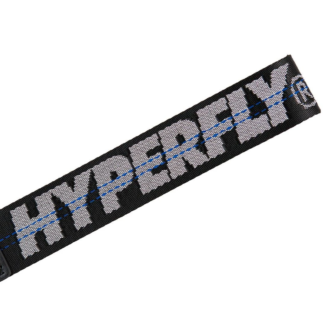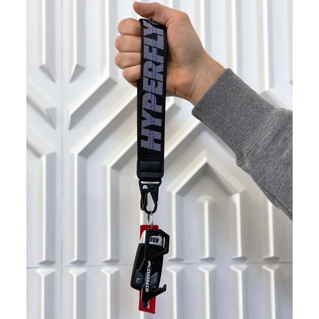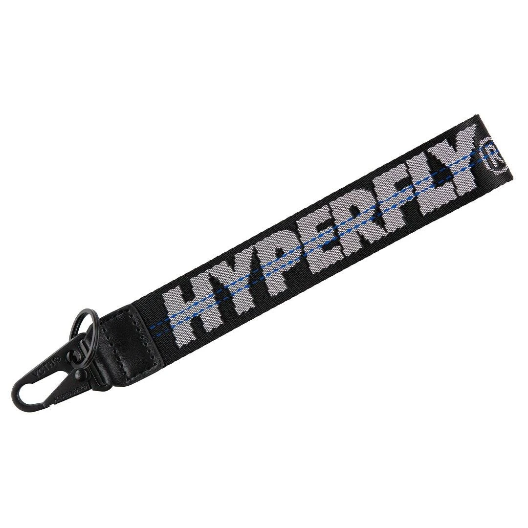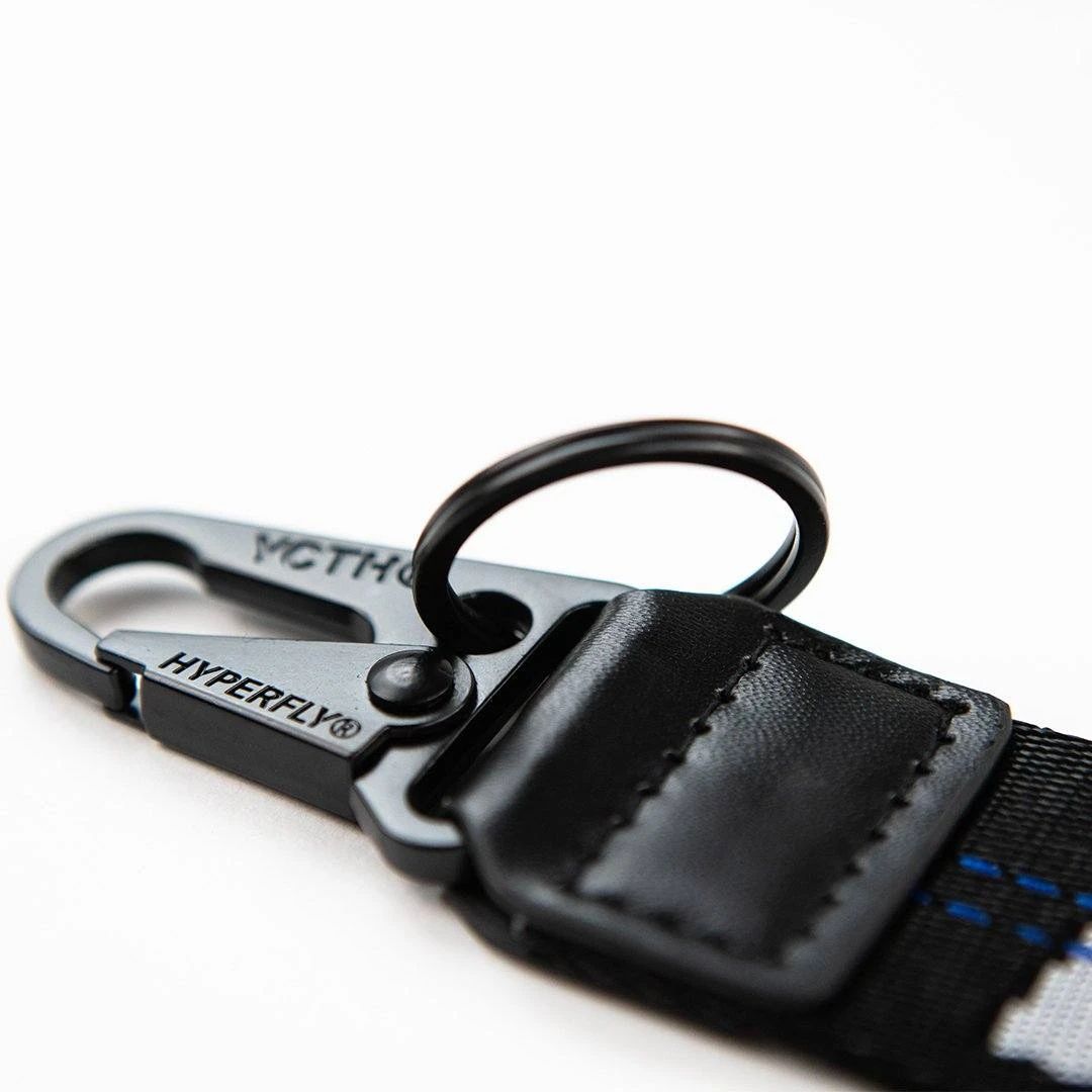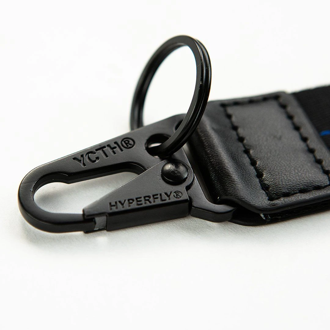 Hyperfly logo pattern woven in grey throughout with a buffed leather trim at drop. YCTH logo engraved clasp fastening at keyring. Mat-tone hardware