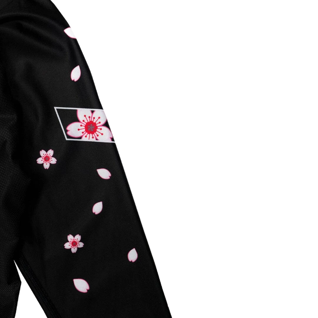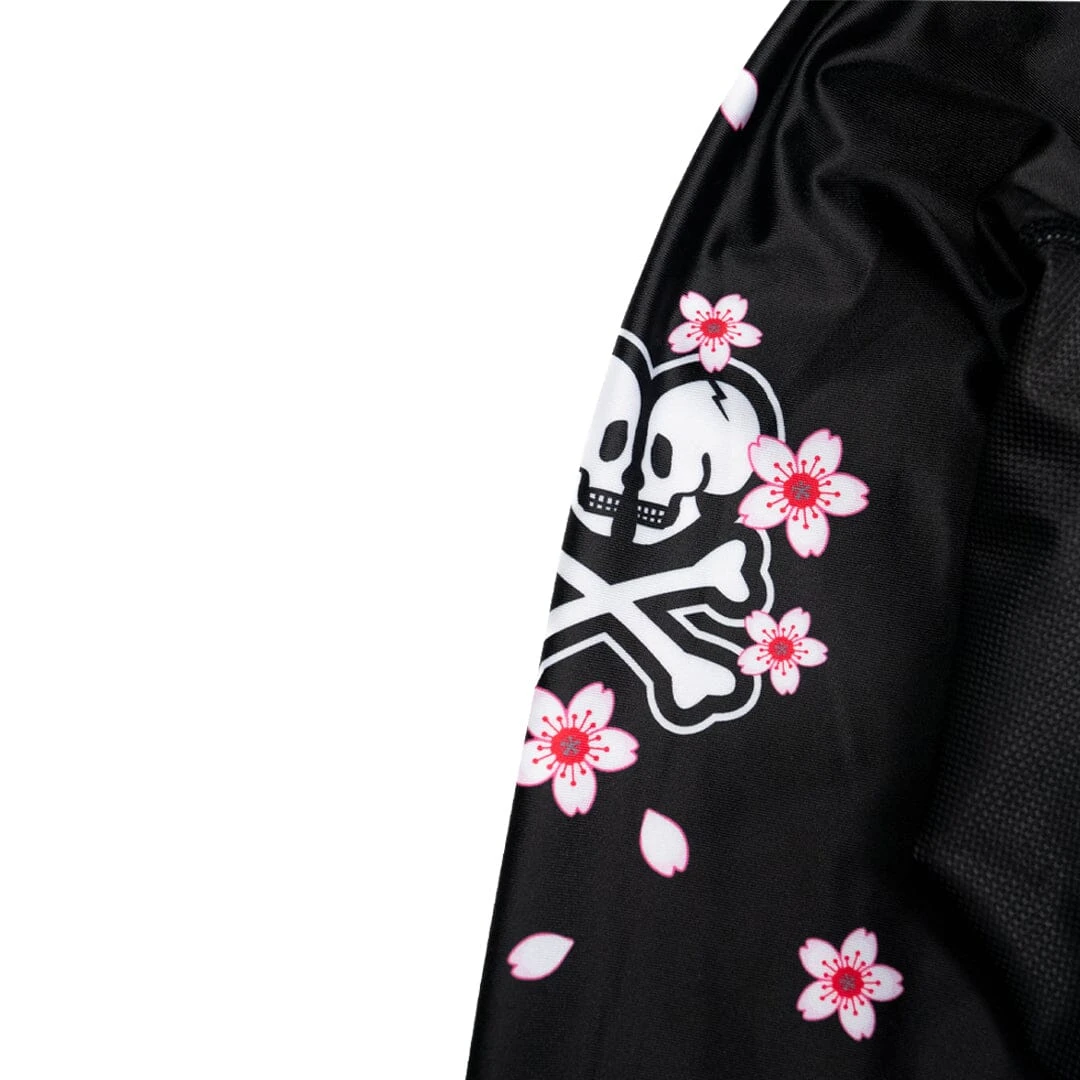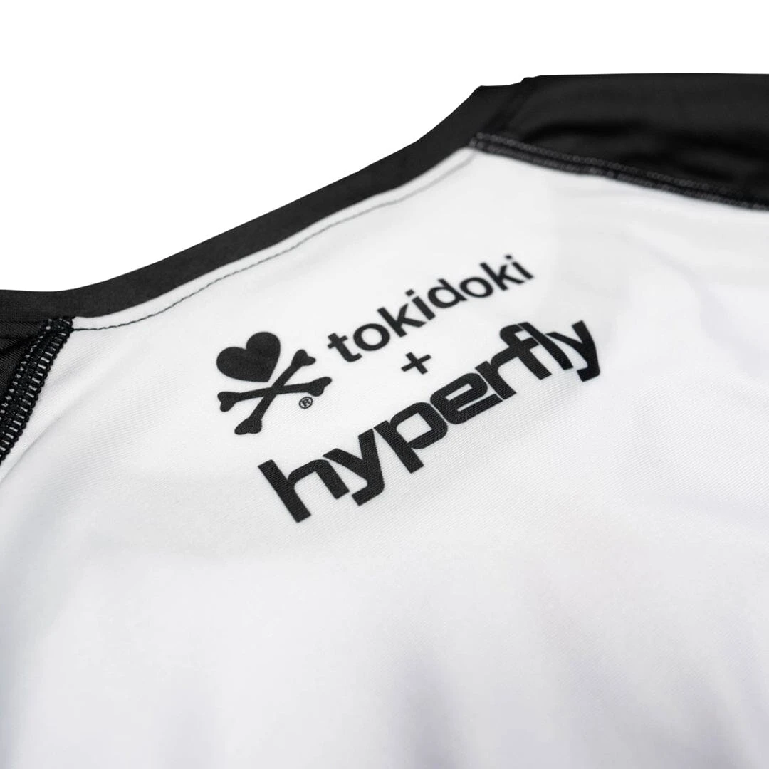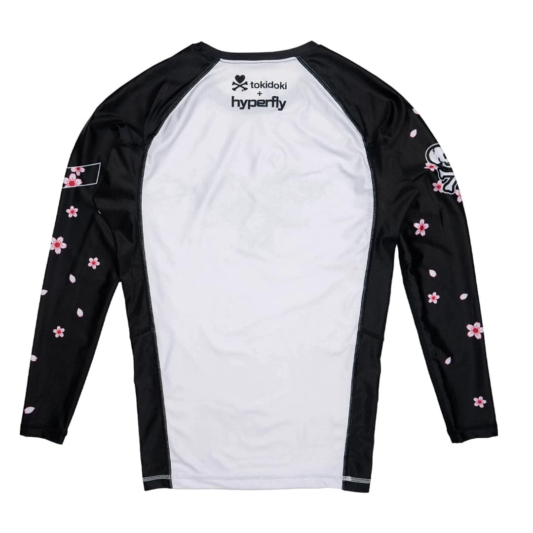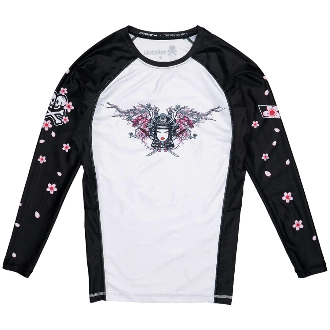 Embrace your inner warrior with the Hyperfly + Tokidoki Warrior Rash Guard, a bold fusion of jiu jitsu performance and vibrant artistry. This one-of-a-kind rash guard showcases a stunning Tokidoki girl adorned in traditional Japanese samurai battle attire, complete with dual katanas and intricate dragon motifs that symbolize strength and resilience. The artistry extends to the sleeves, where cherry blossoms gracefully cascade around Hyperfly and tokidoki logos.