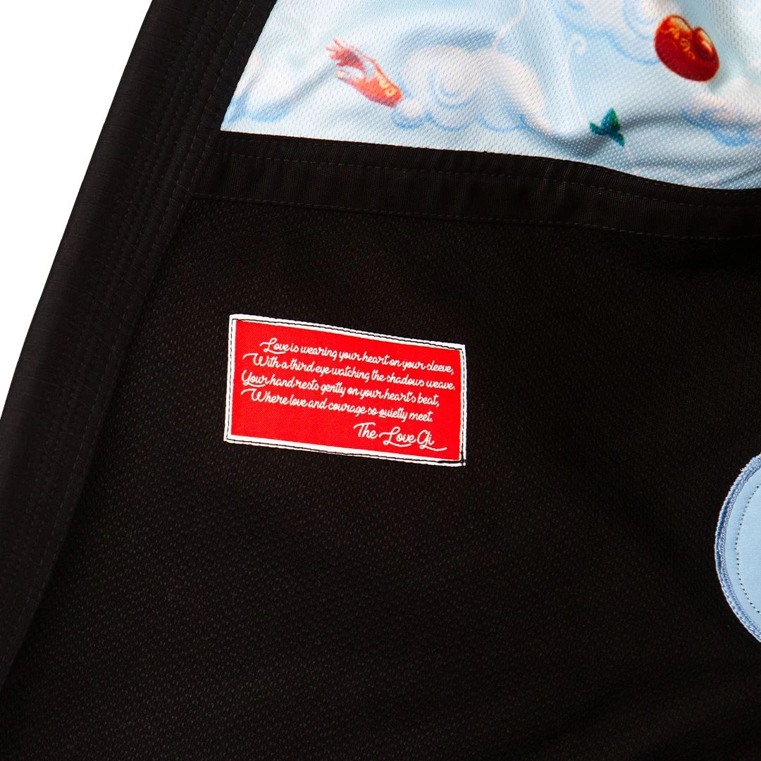 Add a touch of whimsy to your training with our “Heart on Your Sleeve” Gi! It’s like wearing a love poem stitched into every thread, where your heart’s rhythm meets the courage tucked quietly beneath. With a playful third eye motif peeking through blue cloud patterns, this middleweight Gi weaves shadows and tales of bravery into its very fabric. Intricately embroidered designs dance across the material, echoing the poem’s tender verses. Each detail, crafted with love, serves as a reminder of the strength in vulnerability. This Gi isn’t just your armor—it’s a declaration of resilience, wrapped in the poetic power of love. Perfect for those who fight with heart and train with soul.